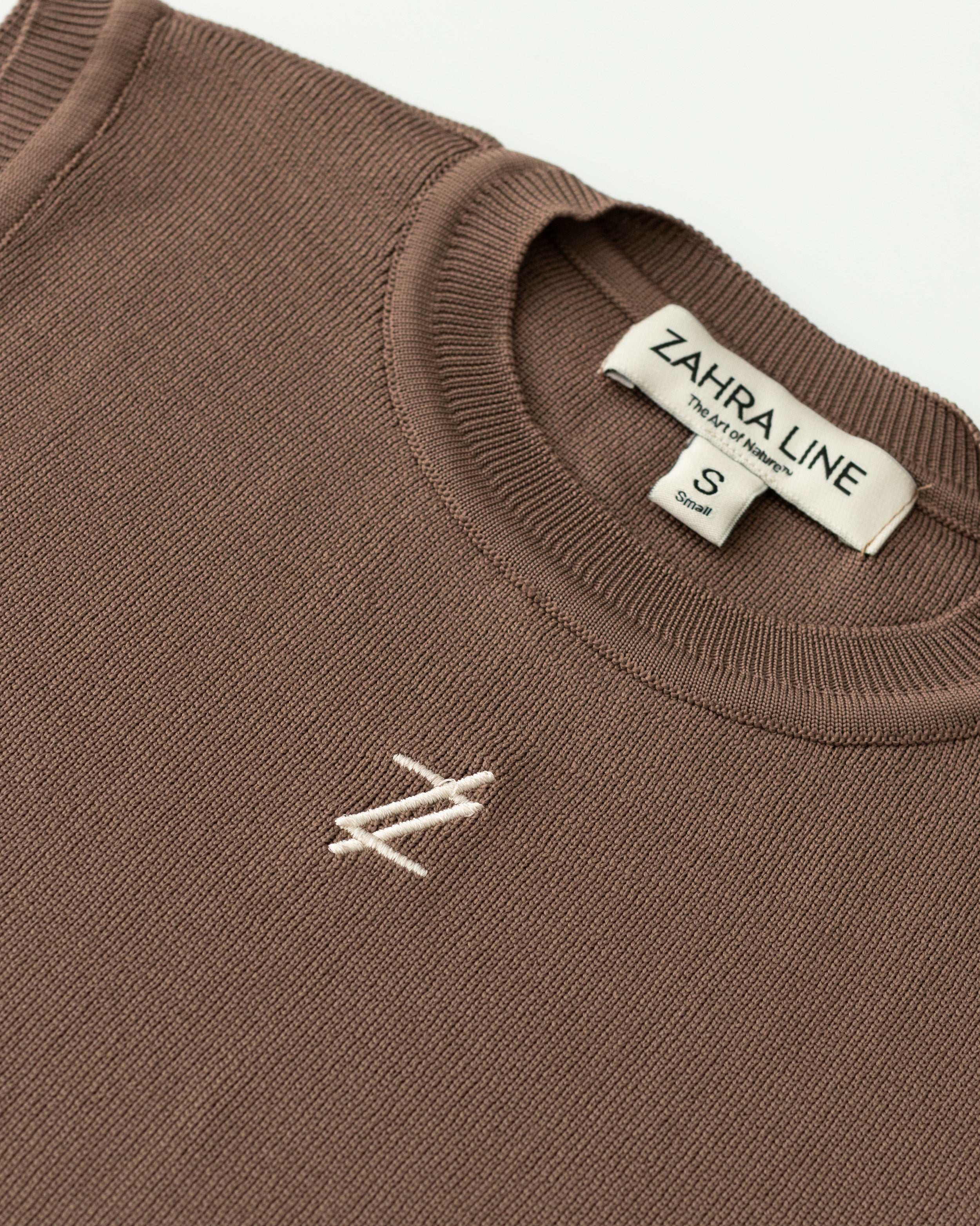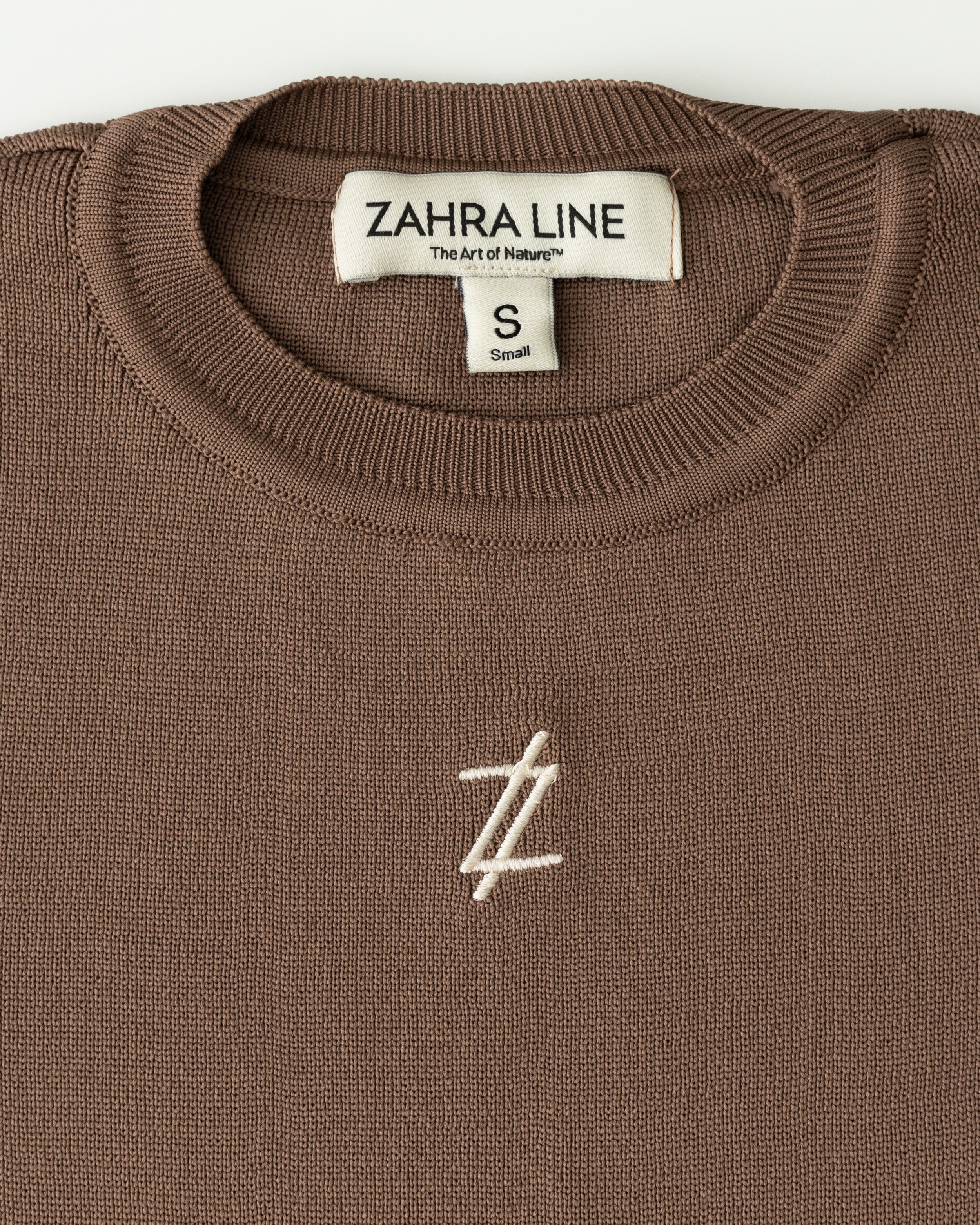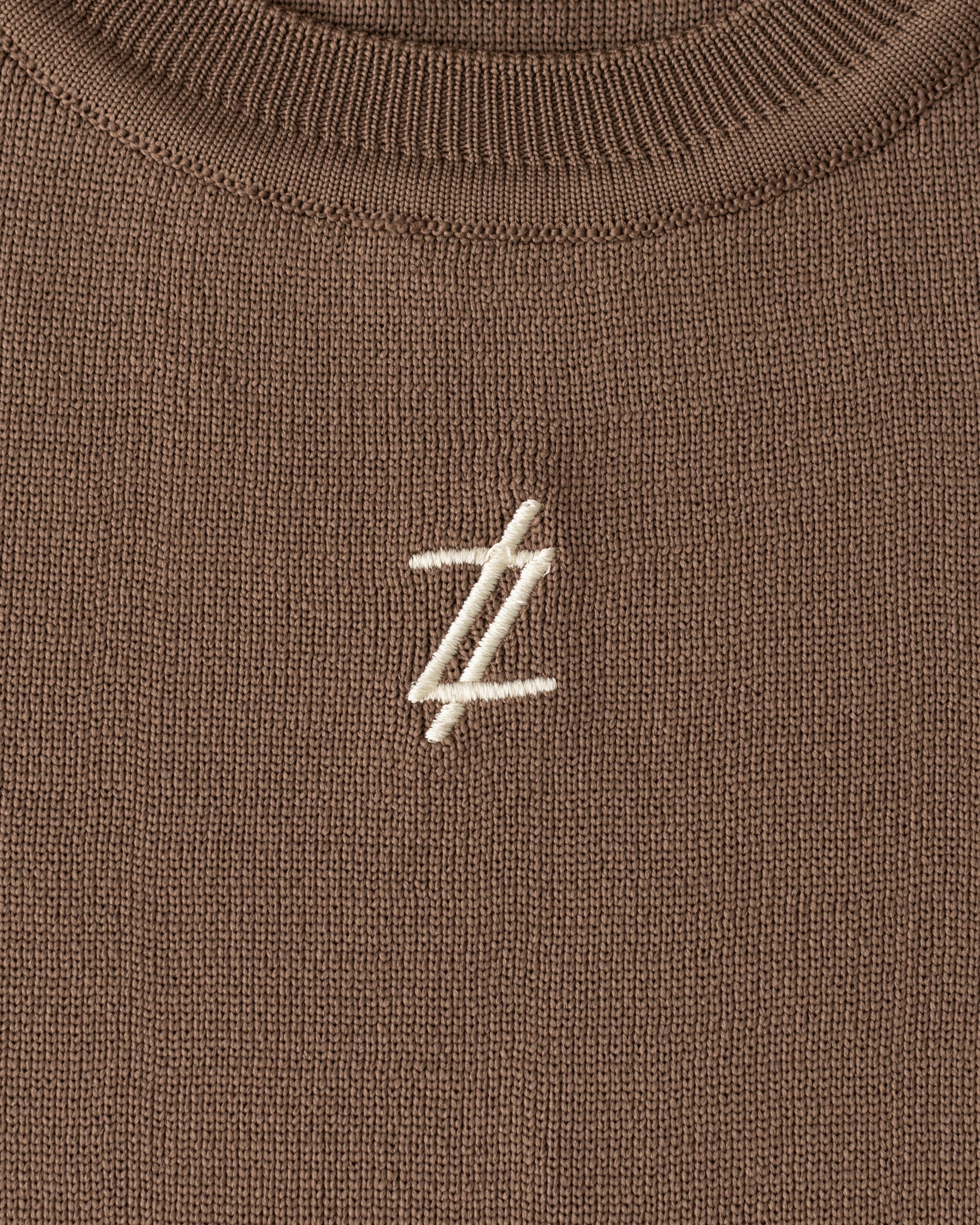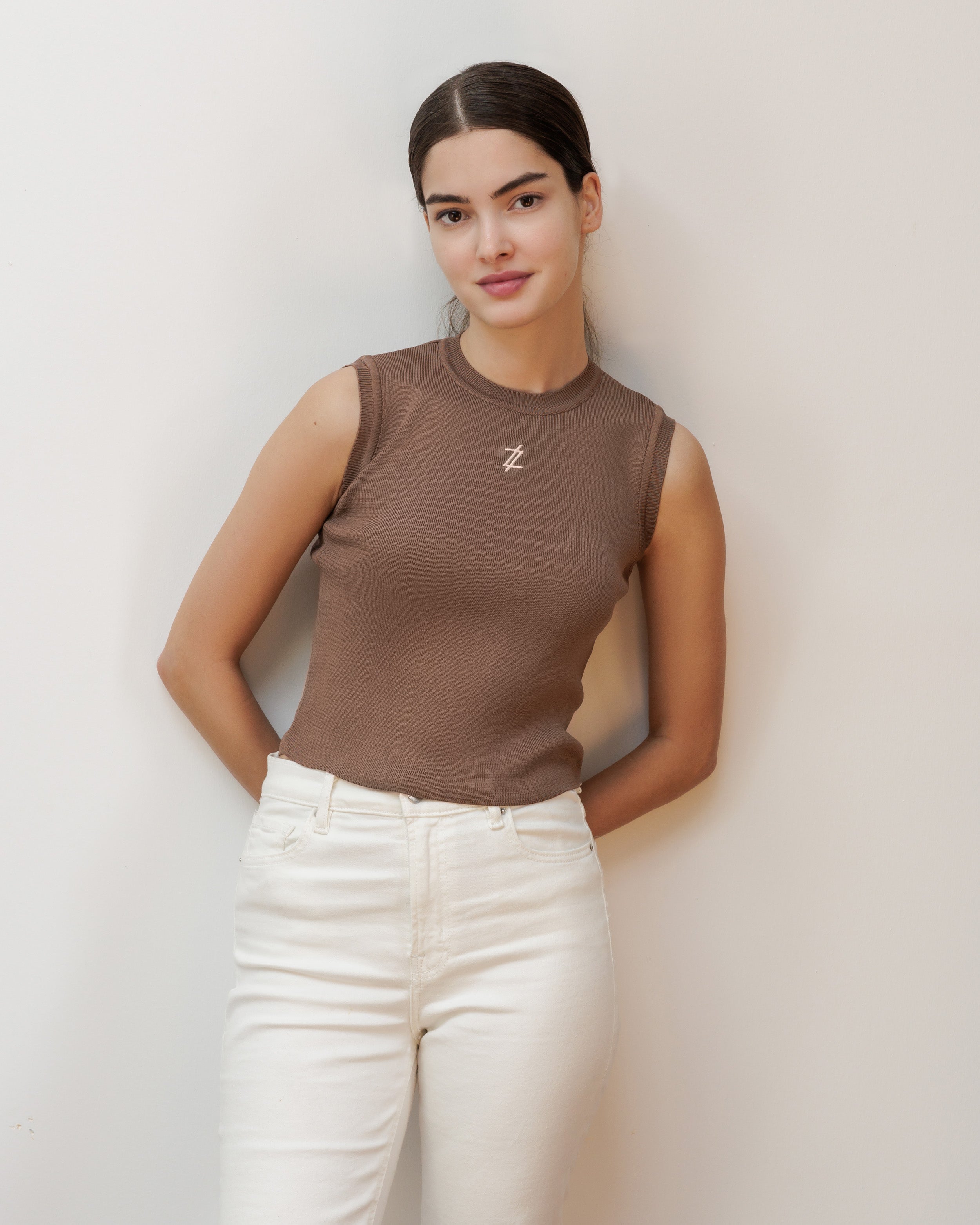 Sleeveless top in sand with a beige logo.