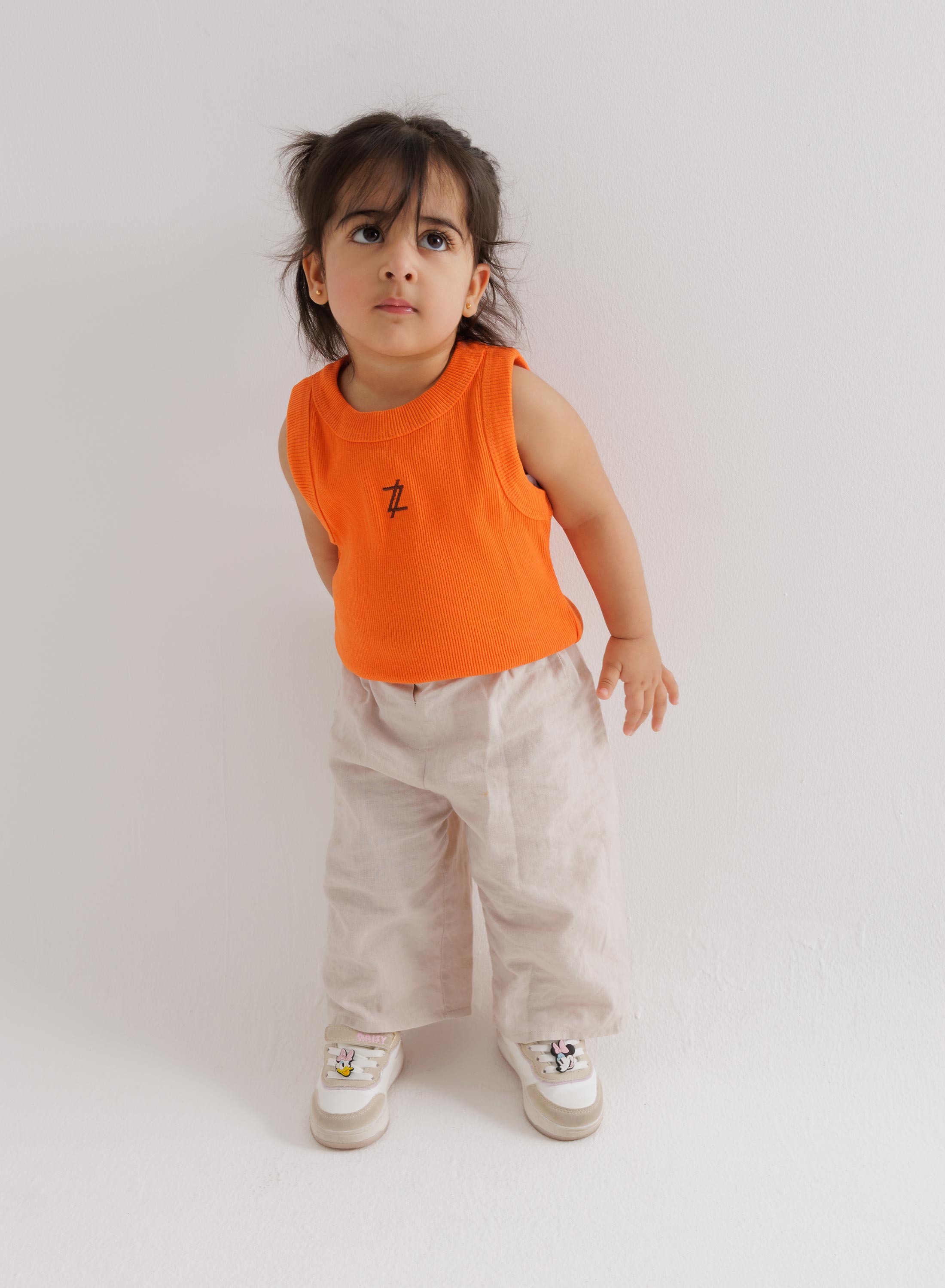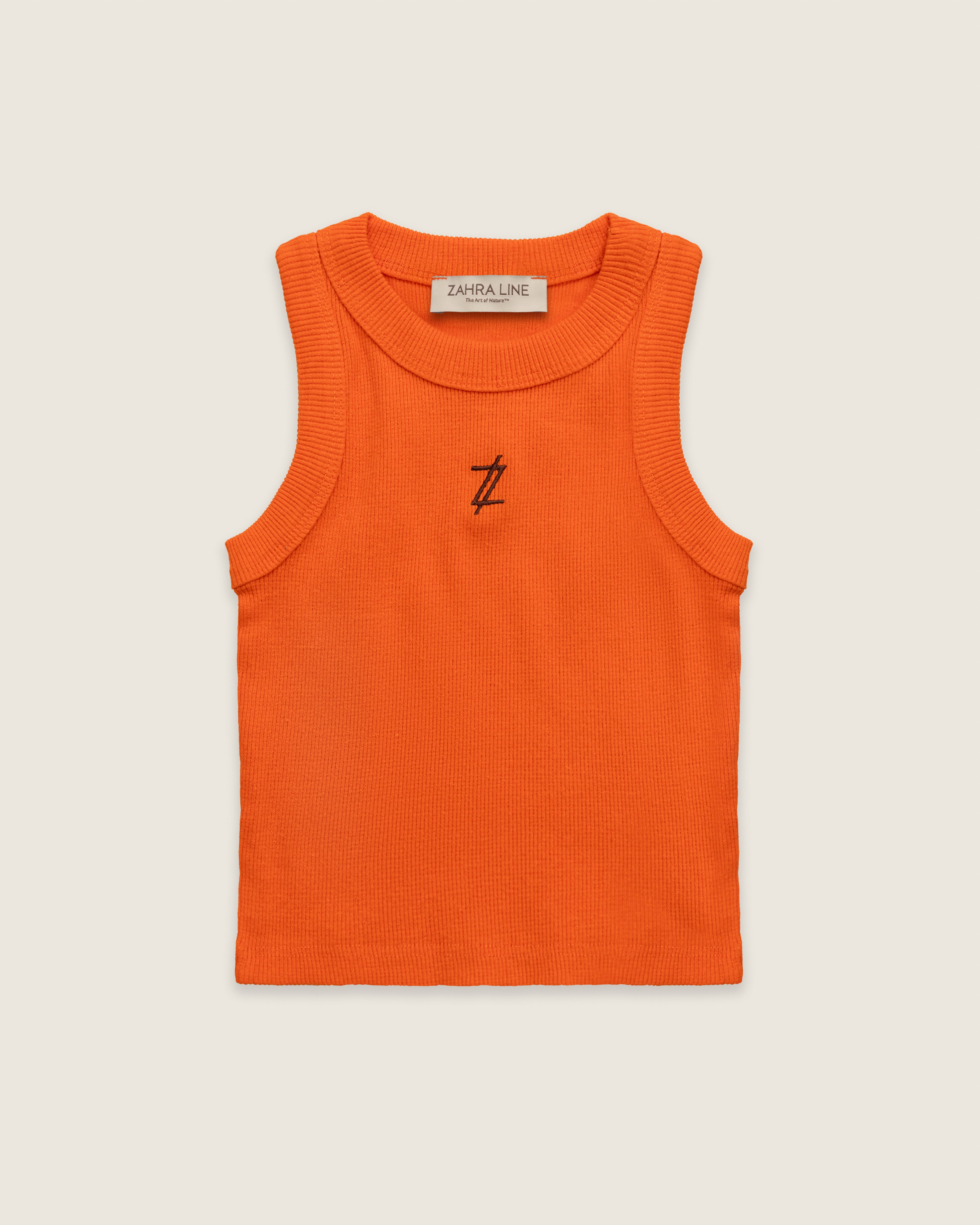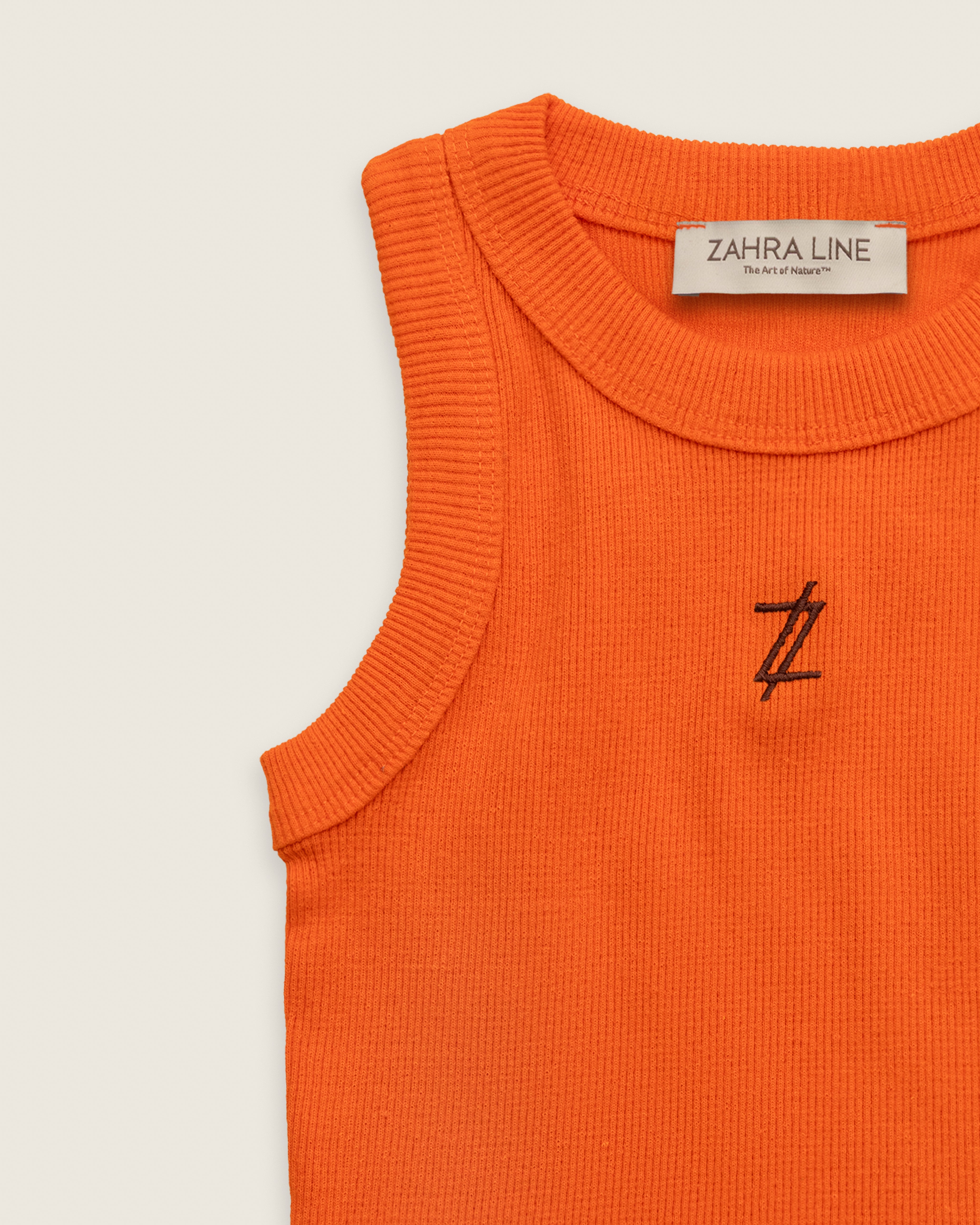 Introducing our Comfortable Sleeveless Top in orange color with embroidered logo.
