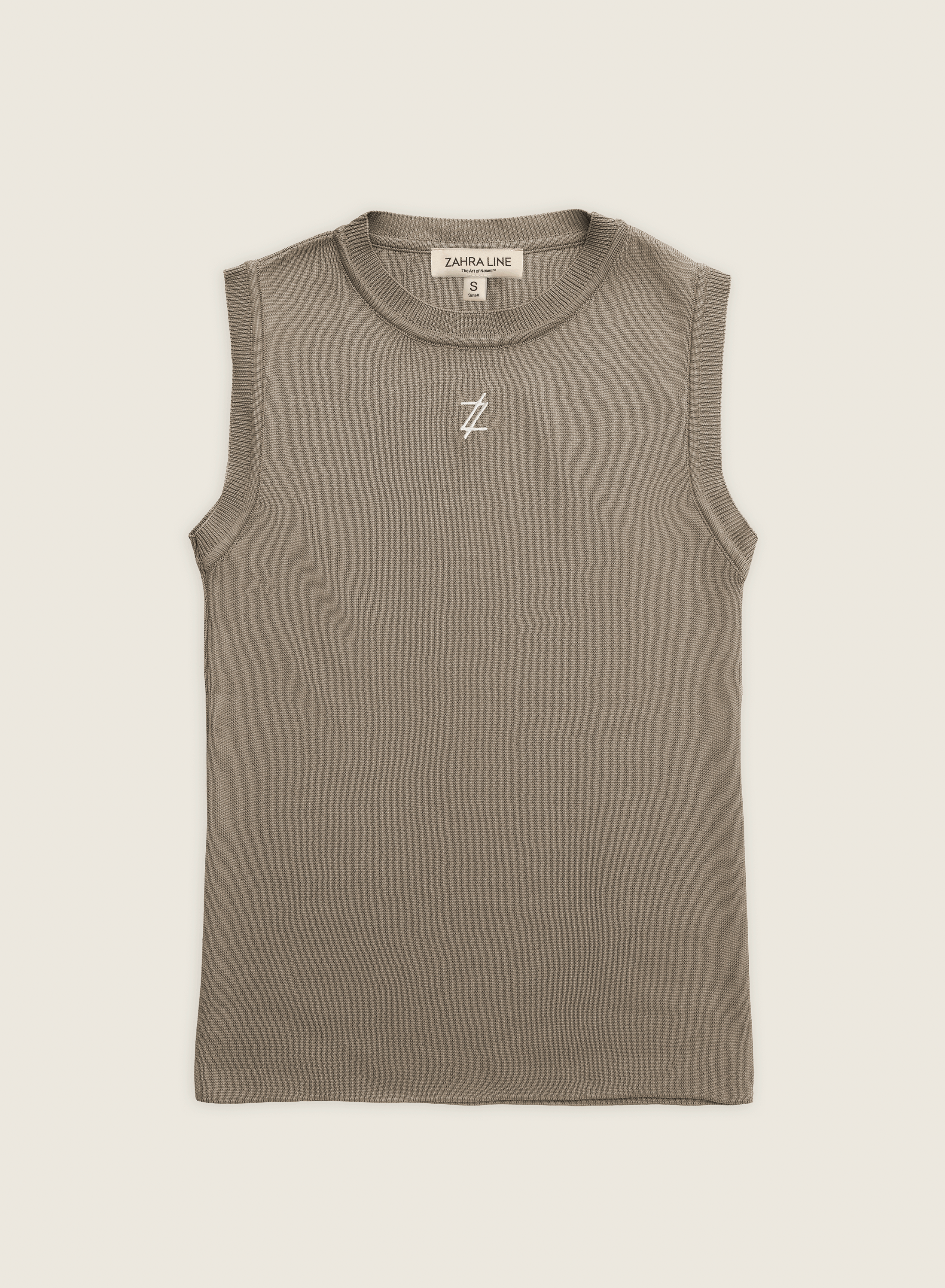 Introducing our Comfortable Sleeveless Top in Brownish Gray Color with off white embroidered logo.