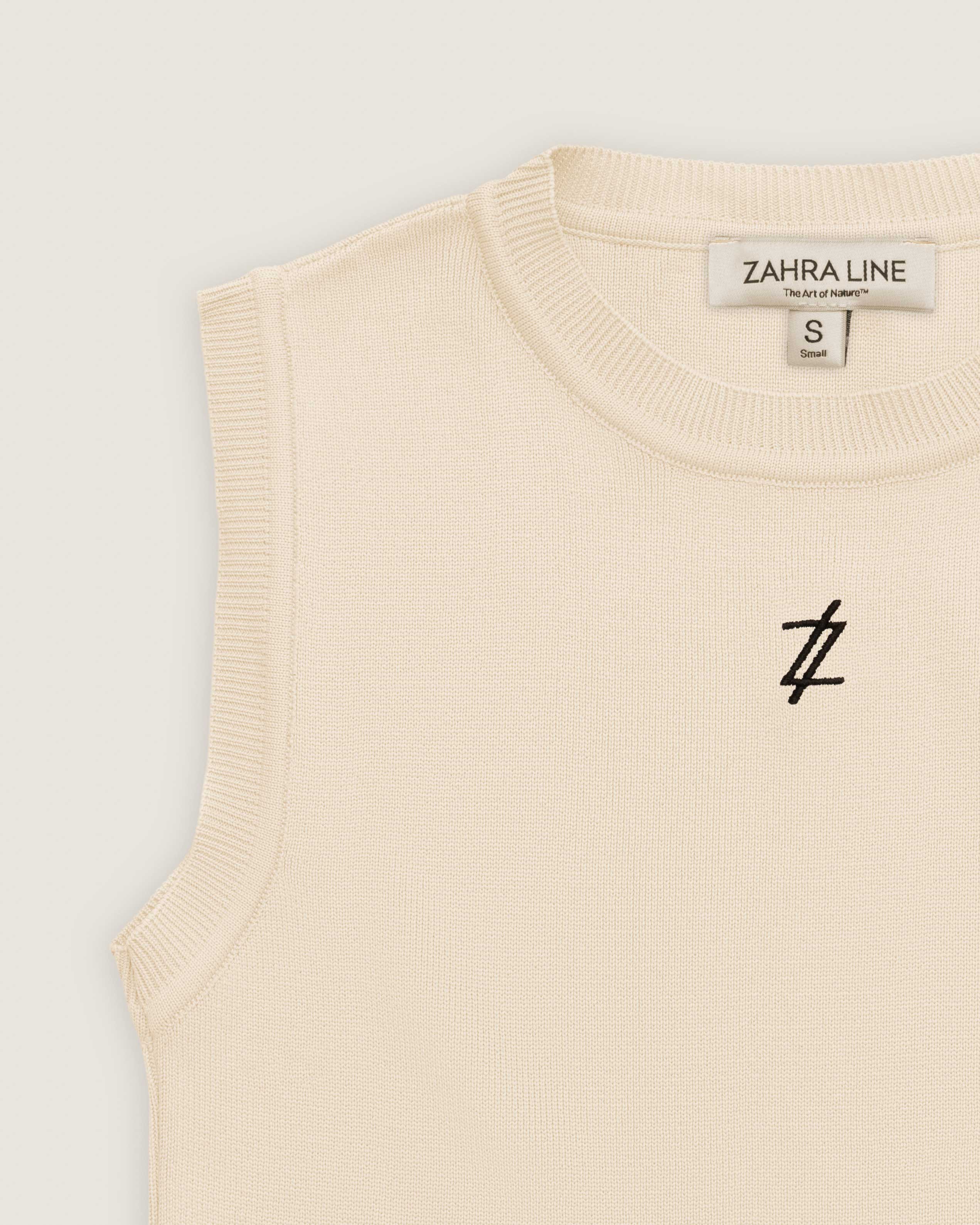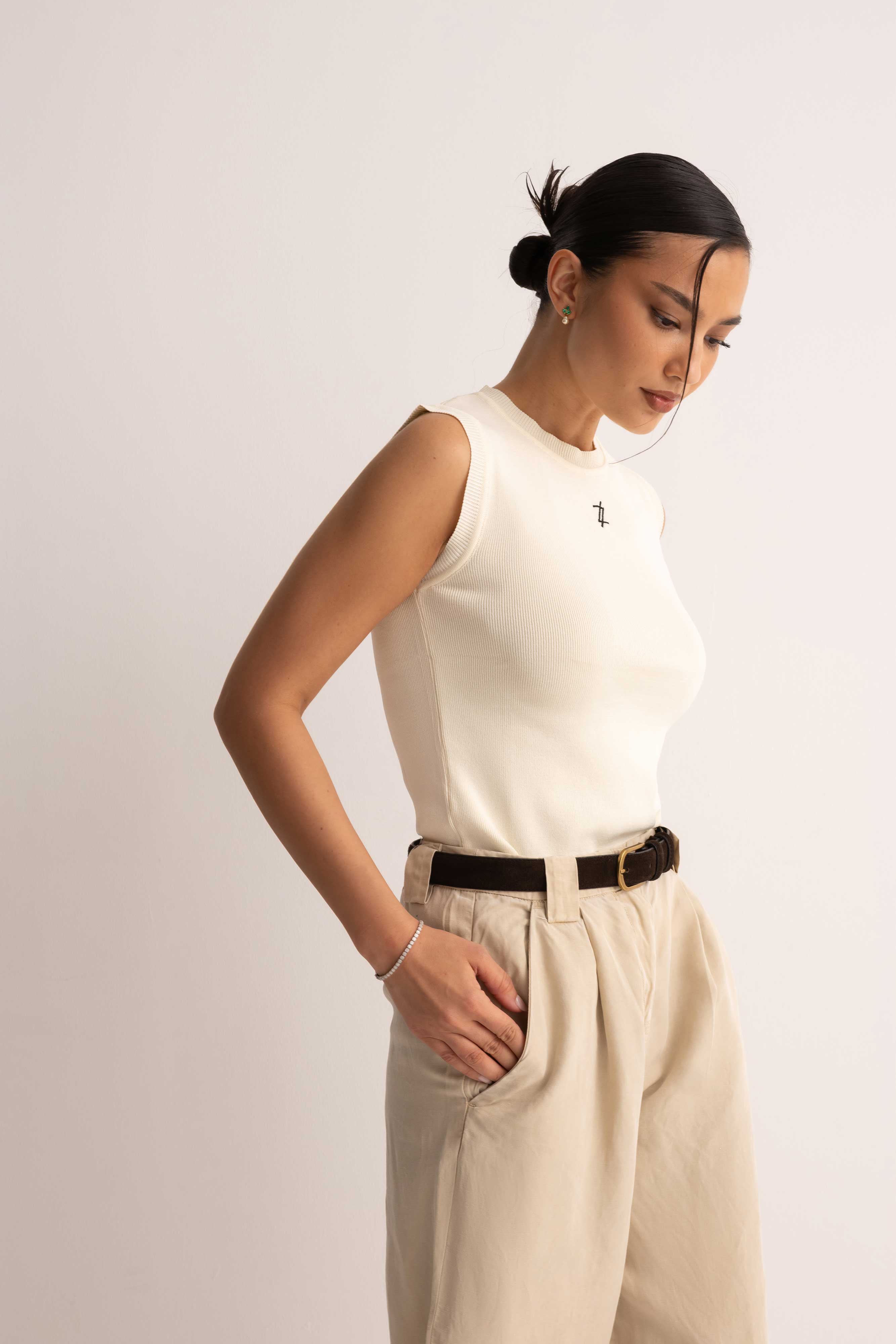 Introducing our Comfortable Sleeveless Top in off white with black embroidered logo.